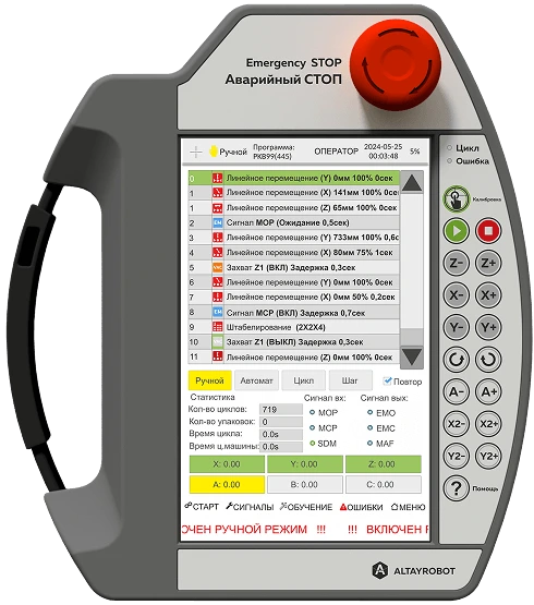 Классический интерфейс на русском языке табличного типа для опытных операторов роботизированной техники, для создания сложных задач и траекторий, с возможностью программирования входов и выходов контроллера.